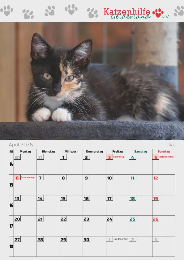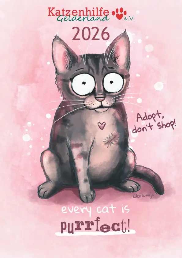 Auf den Rückseiten der Kalenderblätter sind Informationen zu unserem Verein sowie Wissenswertes zur Katzenhaltung zu finden. Außerdem ist das Kalendarium wieder etwas größer, damit man Termine usw. eintragen kann, und die Feiertage – dieses Mal auch diverse „Katzen-Feiertage“ – sind gekennzeichnet. Natürlich zeigen die Kalenderblätter unsere (ehemaligen) Schützlinge aus dem Jahr 2025.